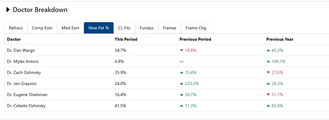 | ✓Practice-wide averages | ✓Split by location, doctor, and team |