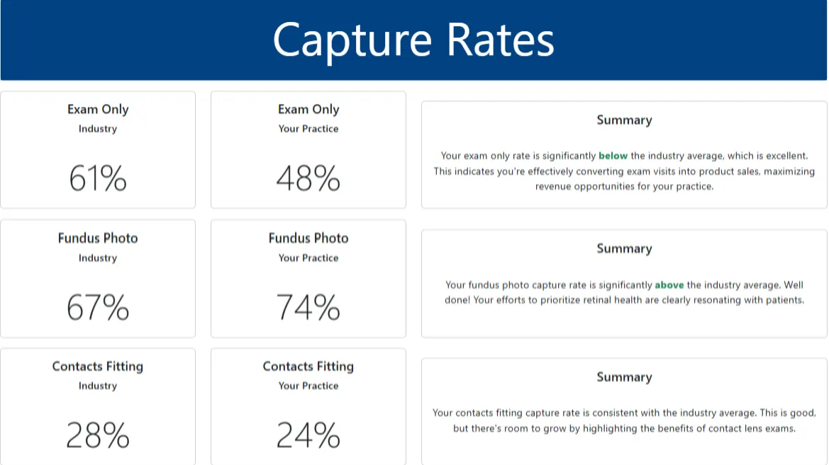 | ✓Generic benchmarks | ✓Optometry-specific industry standards |